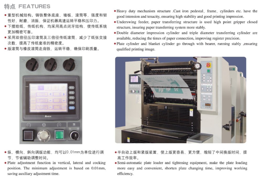 Mesin Cetak Offset Pencetakan Label Empat Warna A3 Besar direka bentuk dengan modul berprestasi tinggi, dan kesemuanya adalah penggelek dan gear berketepatan tinggi berkualiti tinggi, mekanisme suapan kertas yang kuat, sistem pendaftaran kertas berketepatan tinggi dan sistem bekalan dakwat yang stabil. Ia disesuaikan untuk memenuhi keperluan pasaran untuk cetakan warna potongan yang berkualiti tinggi, cekap dan berpatutan. Anda tidak perlu berpegang pada satu ketebalan kertas sahaja—ia berfungsi dengan kertas nipis (0.04mm) sehingga kadbod tebal (0.4mm). Terdapat juga kawalan skrin sentuh dengan antara muka pengaturcaraan intuitif, membolehkan anda melaraskan tetapan dan parameter pencetakan dengan cara yang pintar dan mudah.